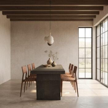 Mesa de comedor artesanal de gran formato y madera maciza.
